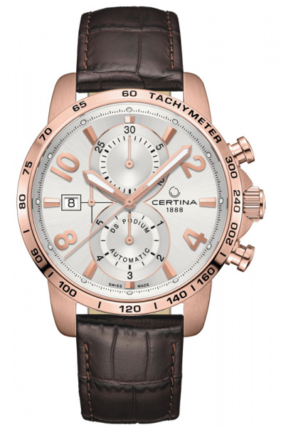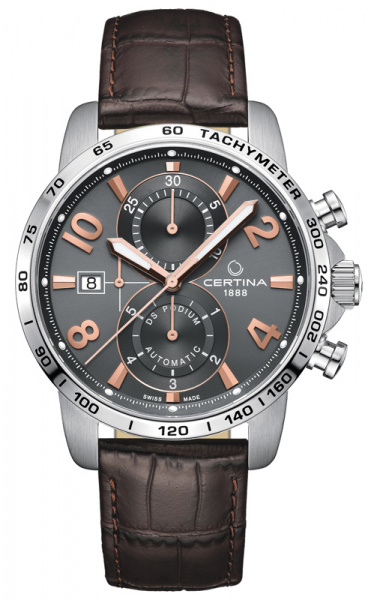 Certina DS Podium je klasický představitel pánských sportovních hodinek Certina. Ve svém nejnovějším provedení zaujme obzvláště moderním vzhledem. Pouzdro z kvalitní nerezové oceli o průměru 44 mm vkusně doplňuje šedý ciferník vylepšený povrchovou úpravou sunburst. Velkoryse dimenzované hodiny a indexy, výrazné ručičky s luminiscenční vrstvou a elegantní chronograf jsou zdobené akcenty v barvě růžového zlata. Robustní tlačítka lemují šroubovací korunku s perfektní ochranou. Tmavě hnědý řemínek z telecí kůže s krokodýlím vzorem a motýlkovou sponou zajišťuje bezpečné uchycení hodinek na zápěstí.