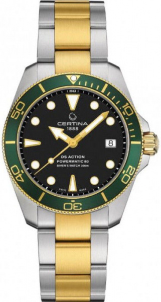 Název mluví za vše: model DS Action Diver je připraven na každou akci. S jistotou doprovodí svého majitele na obchodní jednání, do bazénu nebo třeba na slavnostní večeři. Za tuto všestrannost vděčí sportovnímu a zároveň elegantnímu stylu v kombinaci s vlastnostmi robustních potápěčských hodinek. Na černém lakovaném číselníku vynikají indexy hodin a ručičky zlaté barvy potažené luminiscenční vrstvou Super-LumiNova®. Tato patentovaná vrstva zaručí perfektní čitelnost i ve tmě. Pouzdro je rámované jednosměrnou lunetou smaragdově zeleného zbarvení se zlatou časovou stupnicí ponoru a světelným značením. Dokonalost tohoto modelu završuje dvoubarevný náramek z nerezové oceli s PVD vrstvou zlaté barvy a zapínáním s prodloužením náramku při potápění.