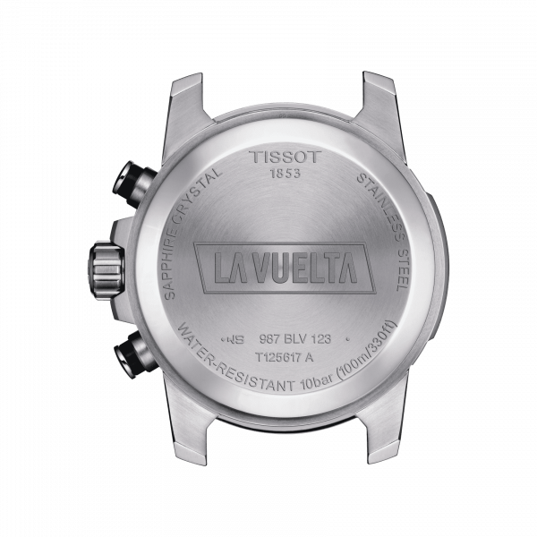 Hodinky Tissot T125.617.17.051.01 mají ocelové pouzdro o průměru 45 mm. Na víčku hodinek je vygravírovaný nápis La Vuelta. Další cyklistický prvek je vidět na vteřinové ručičce, kde je model kola. Vteřinovka je kontrastní na černém číselníku. Hodinky mají základní funkce, datumovku na pozici šesté hodiny, stopky a tachymetr. Číselník hodinek je krytý safírovým sklíčkem. Jsou dodávány ve speciální dárkové krabičce, kde najdeme i náhradní řemínek. Jeden řemínek je červeno černý, nylonovo pryžový, a druhý řemínek je černá kůže. Hodinky pohání kalibr ETA G10.212. Hodinky jsou dodávány ve speciálním balení.