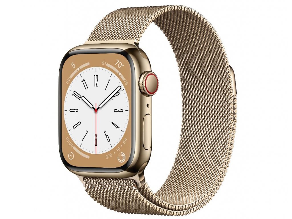 Apple Watch Series 8 GPS + Cellular 41mm zlaté pouzdro z nerezové oceli se zlatým milánským tahem MNJF3CS/A