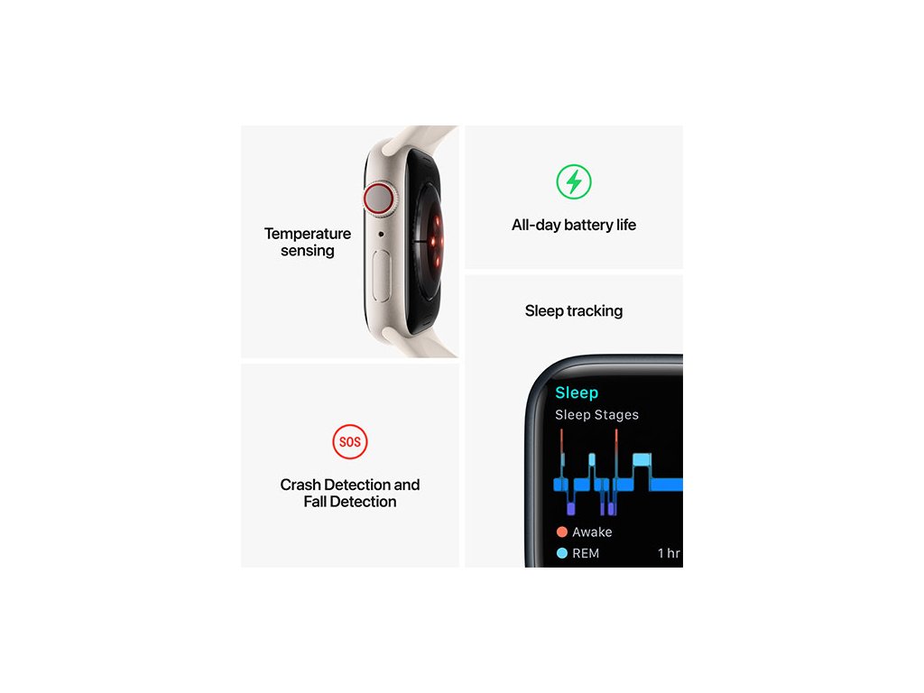 Apple Watch Series 8 obsahují pokročilé zdravotní senzory a aplikace, které vám umožňují měřit srdeční frekvenci, kyslík v krvi a také sledovat změny tělesné teploty. Díky detekci autonehody, sledování spánku a pokročilým metrikám cvičení vám pomůže zůstat aktivní, zdravý, připojený a v bezpečí.