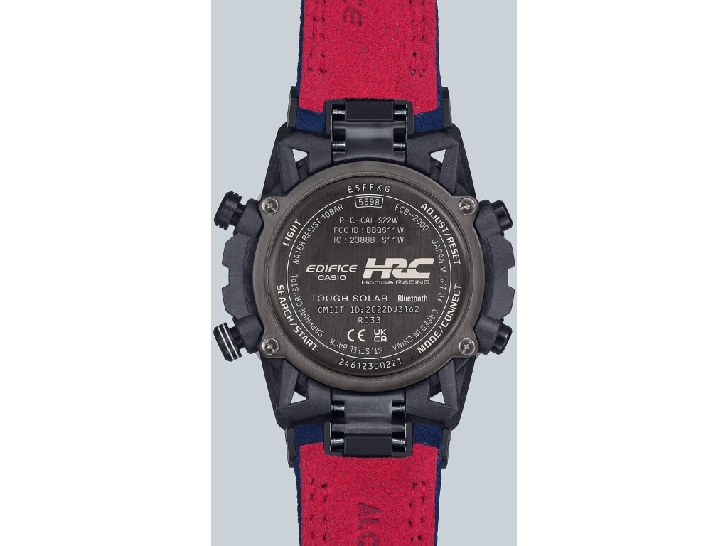 Casio Edifice x Honda Racing jsou poctou vítězstvím týmu HRC na světových závodních okruzích. Jejich trojbarevné provedení zobrazuje barvy týmu Honda a odkazuje na jeho filozofii. Červená barva značí "touhu zvítězit", modrá "pokročilé technologie" a bílá "fanoušky motosportů", což je mimochodem zobrazeno na kovovém kroužku na řemínku. Týmové barvy nechybí ani na řemínku z Alcantry, najdete na něm i laserem vytvořené obrazce ventilu a ojnice motoru Honda. Loga HRC a Honda najdete na číselníku, řemínku i dýnku hodinek.