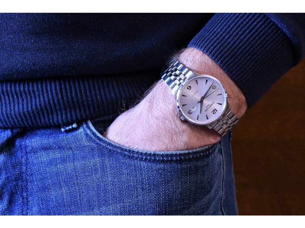 Krásné pánské hodinky švýcarské výroby od značky Certina z řady DS Caimano zaujmou svým klasickým elegantním vzhledem a precizním zpracováním. Hodinky jsou vyrobeny z ušlechtilé oceli 316L a svým průměrem pouzdra 39 mm se řadí mezi středně velké pánské modely. Dobře čitelný stříbrný číselník nabízí ručky a body s vrstvou luminiscence pro lepší čitelnost i ve tmě a ukazatel data na pozici čísla "3". To vše kryje safírové sklíčko odolné vůči poškrábání. Celkový vzhled hodinek doplňuje kovový tah z ušlechtilé oceli 316L v matném a lesklém provedení s motýlkovou sponou. Vodotěsnost modelu je 100 M a hodinky tak snesou běžný styk s vodou a plavání.
