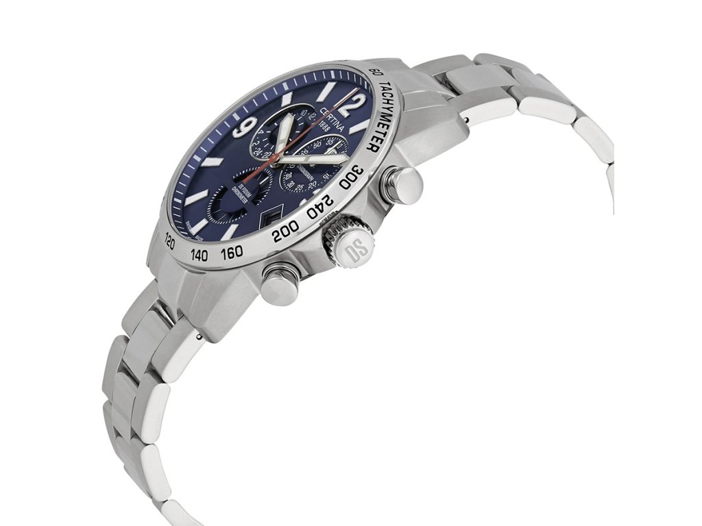 Švýcarké luxusní hodinky Certina z řady DS Podium Chronograph GMT o průměru 42 mm se řadí do kategorie větších pánských hodinek. Ukazují klasický čas, mají chronograf a tachymetr, datumovka je umístěna na pozici č. "4", ukazatel druhé časové zóny GMT v menším číselníku na levé straně. Detailně propracovaný číselník chrání antireflexní safírové sklo, které je odolné vůči poškrábání. Jsou vodotěsné 100 metrů, tudíž můžete s hodinkami plavat a šnorchlovat. Hodinky jsou vyrobeny kompletně z titanu, tudíž jsou vhodné pro alergiky. Tyto hodinky mají quatrzový strojek Precidrive, dosahují skutečné chronometrové přesnosti. S odchylkou +/- 10 sekund za rok jsou hodinky s technologií Precidrive™ osmkrát až desetkrát přesnější než běžné quartzové hodinky. Tyto hodinky jsou svým vzhledem vhodné pro sportovní, ale i elegantní muže.