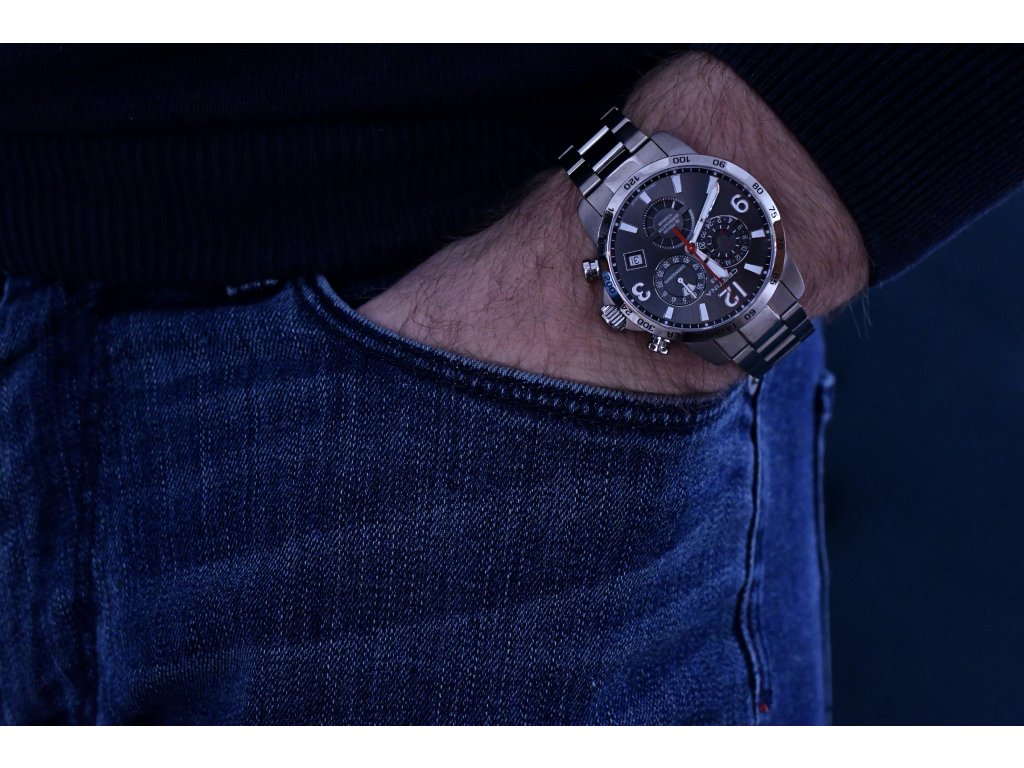 | Funkce: | Datum, Duální čas / GMT, Stopky / Chronograf, Tachymetr, Ukazatel životnosti baterie / E.O.L. |