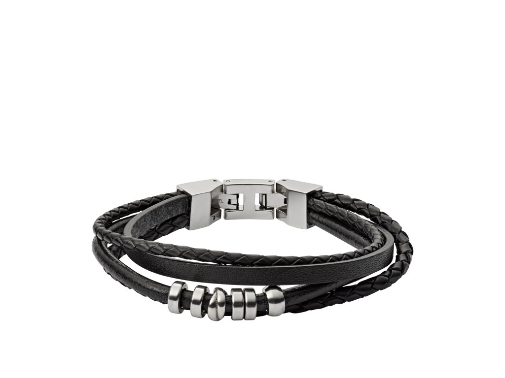 Pánský elegantní kožený náramek je vyrobený s černé kůže a oceli. Kombinace hladkých a propletených kůží ho dělá zajímavým .Ocelové zapínání s jemným nápise Fossil má stříbrnou barvu, je na zacvaknutí a jeden dílek jde oddělit, délku si můžete upravit na 21,5-22,5 cm.