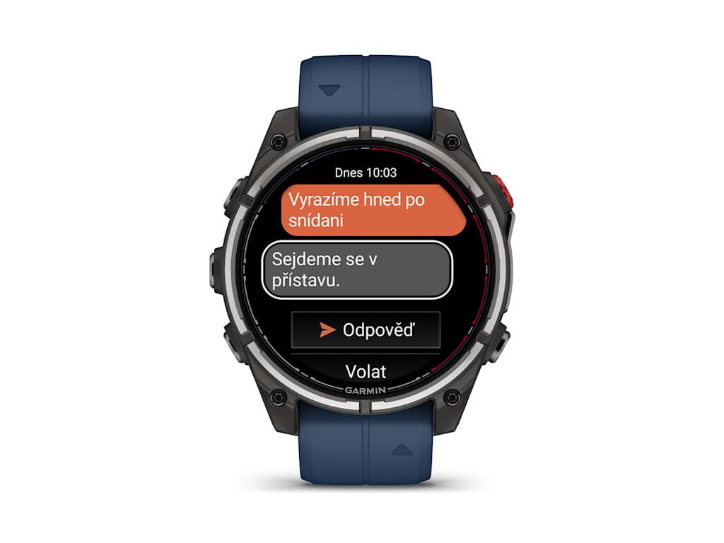 Díky satelitnímu nebo LTE připojení můžete odesílat zprávy ostatním uživatelům aplikace Garmin Messenger přímo z hodinek. Aplikace se automaticky synchronizuje s kontakty, jakmile hodinky spárujete s telefonem.