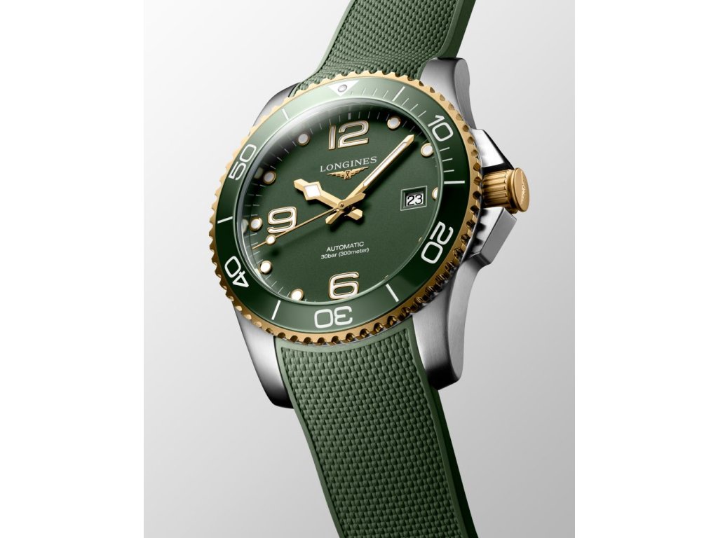Sportovní model pánských hodinek Longines ve střední velikosti, z řady HydroConquest je inspirován vodními sporty, což dokládá vodotěsnost 30 barů, šroubovací korunka a jednosměrně otočná luneta.