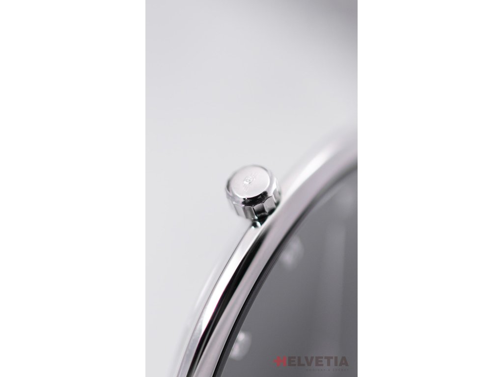 Pouzdro je na pozici třetí hodiny doplněno decentní korunkou s minuskulním logem značky. Číselník je proveden v jednolité matné černé barvě, na místech indexů je osázeno 12 diamantů. Subtilní hodinové a minutové ručky jsou provedeny ve stříbrném leštěném povrchu. Číselník chrání odolné safírové sklíčko.
