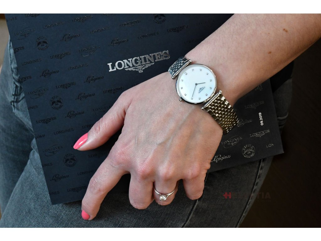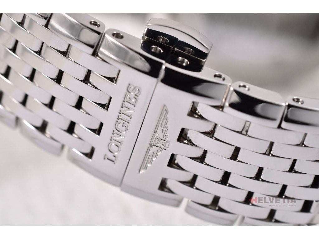 Luxusní dámské quartzové hodinky švýcarské výroby od značky Longines z řady La Grande Classique zaujmou především svým elegantním vzhledem a tenkým pouzdrem, které krásně sedí na každé dámské ruce. Hodinky jsou vyrobeny z ušlechtilé oceli 316L a svým průměrem pouzdra 33 mm se řadí mezi středně velké dámské modely. Bílý ciferník s perletí doplňuje 12 diamantů o hmotnosti 0,048 ct. a kryje ho velmi odolné safírové sklíčko. Celkový luxusní vzhled hodinek doplňuje jemný ocelový tah s motýlkovou sponou.