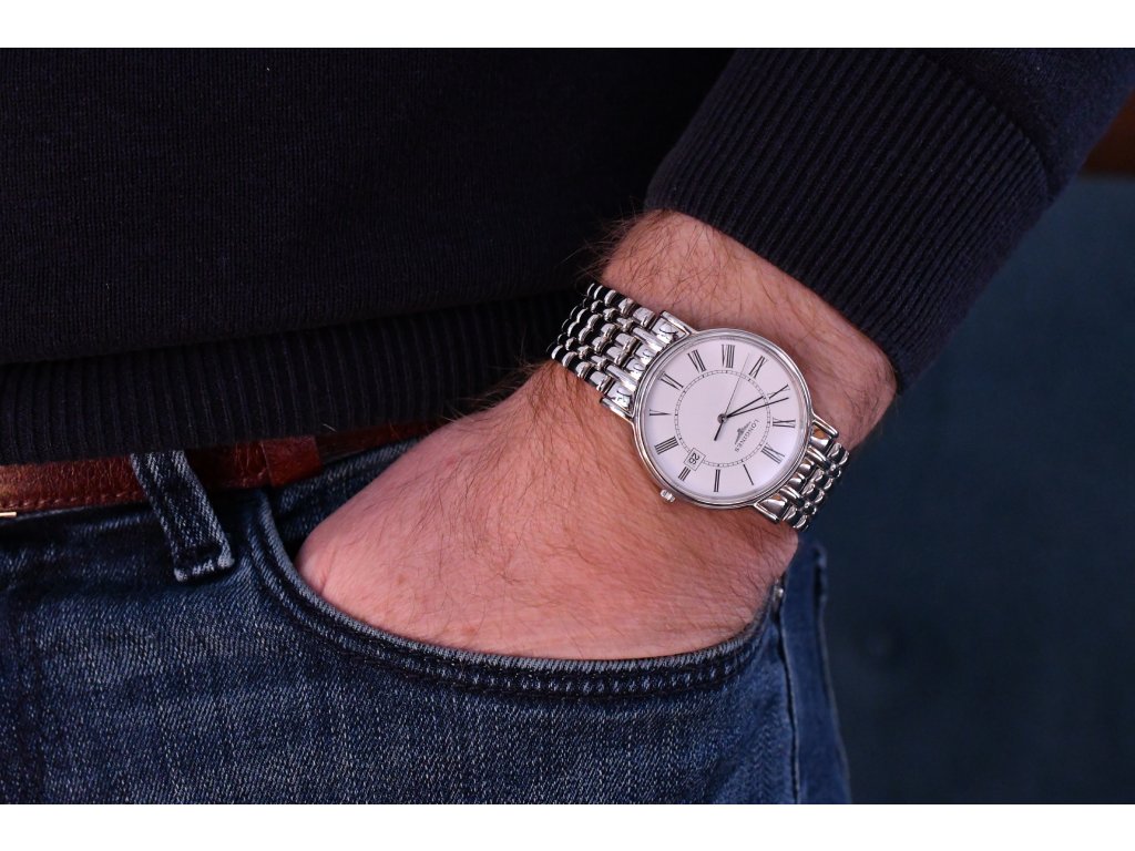 Krásné pánské quartzové hodinky švýcarské výroby od značky Longines z řady Présence zaujmou především svým elegantním vzhledem, který se hodí jak do společnosti tak i pro běžné nošení. Hodinky jsou vy\robeny z ušlechtilé oceli a svým průměrem pouzdra 38, 5 mm se řadí mezi menší pánské modely. Přehledný bílý ciferník nabízí římské číslice a ukazatel data na pozici čísla "3", to vše je chráněno velmi odolným antireflexním safírovým sklíčkem. Vodotěsnost hodinek je 30 M snesou tedy umývání rukou a déšť.