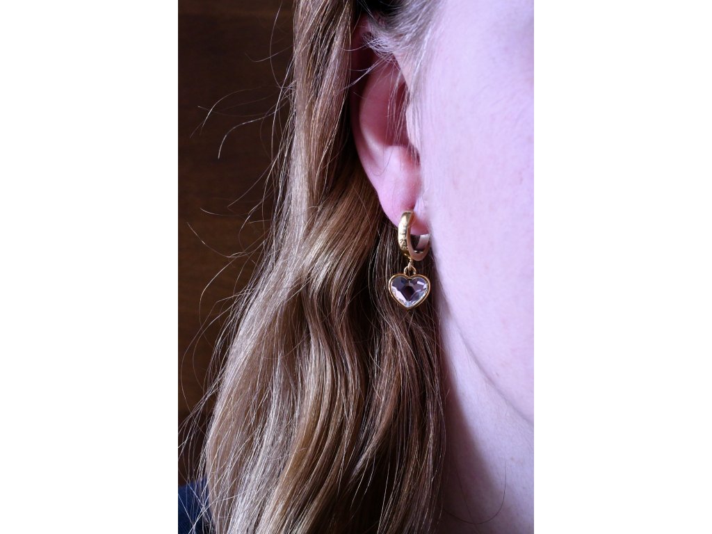 Krásné jednoduché náušnice světoznámé módní značky Guess jsou novinkou roku 2021. Na kroužku naleznete nápis Guess a přívěsek ve tvaru srdce s kamínkem Swarovski.