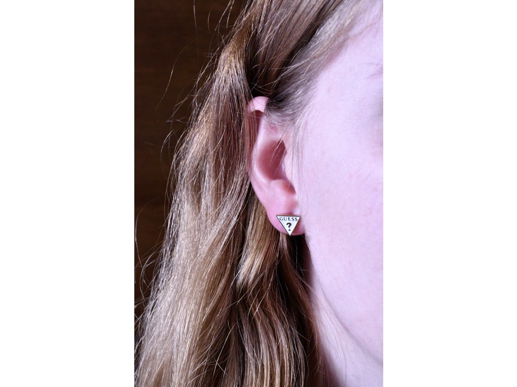 Krásné náušnice světoznámé módní značky Guess va tvaru trojúhelníčku jsou vyrobeny z ušlechtilé oceli v barvě žlutého zlata. Uvnitř jsou bílé barvy s logem značky Guess. Zapínání mají klasicky na puzetu.