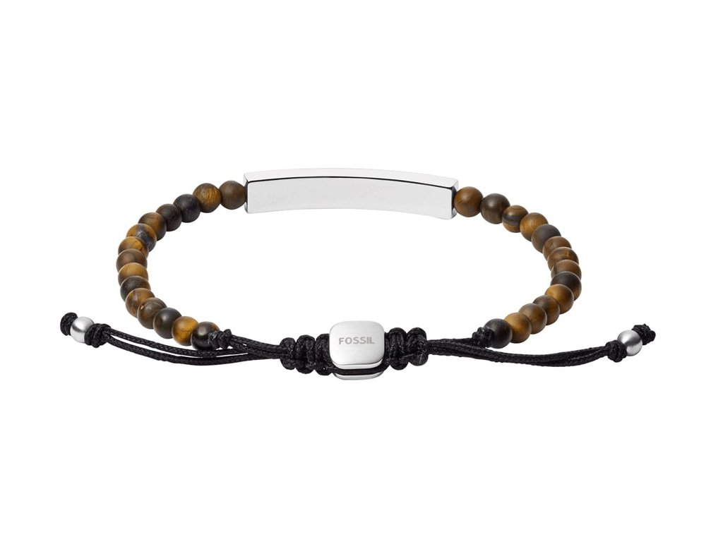 Pánský náramek Fossil kuličkový - tygří oko je nakombinován matnou ušlechtilou ocelí a stahovací šňůrkou kterou si můžete regulovat velikost. Délka: 17 cm - 25 cm. Do placky o rozměrech 3,4 cm x 5,1 cm lze na přání umístit gravírování.