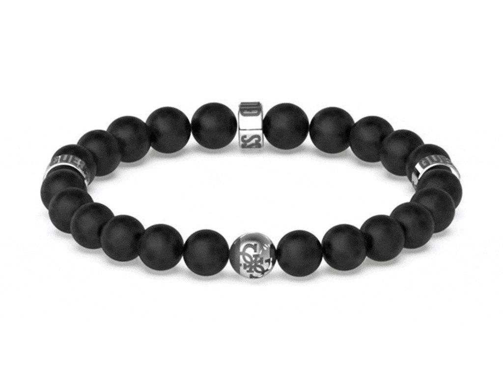 Pánský nadčasový náramek značky Guess, který je složený z černých achátových korálků a ocelových doplňků, které tento náramek krásně oživují. Čtyři korálky, které jsou ocelového vzhledu s černými nápisy Guess a logem jsou dominantou tohoto náramku.
