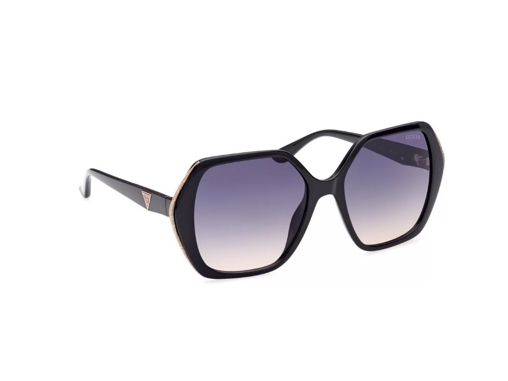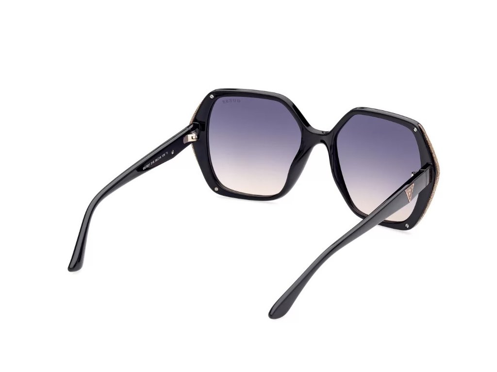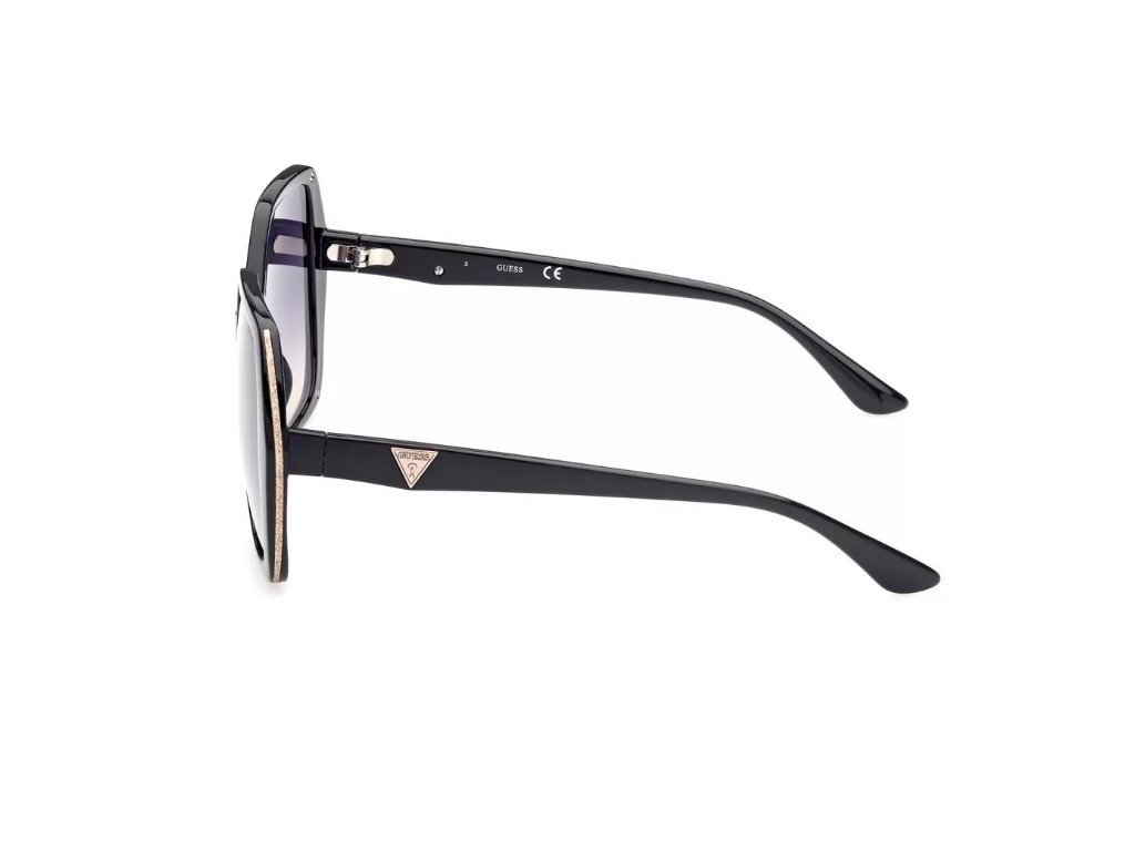 Dámské, výrazné módní sluneční brýle většího hranatého vzhledu. Skla brýlí mají fialový podtón, straničky jsou tenké s jemným Guess logem.