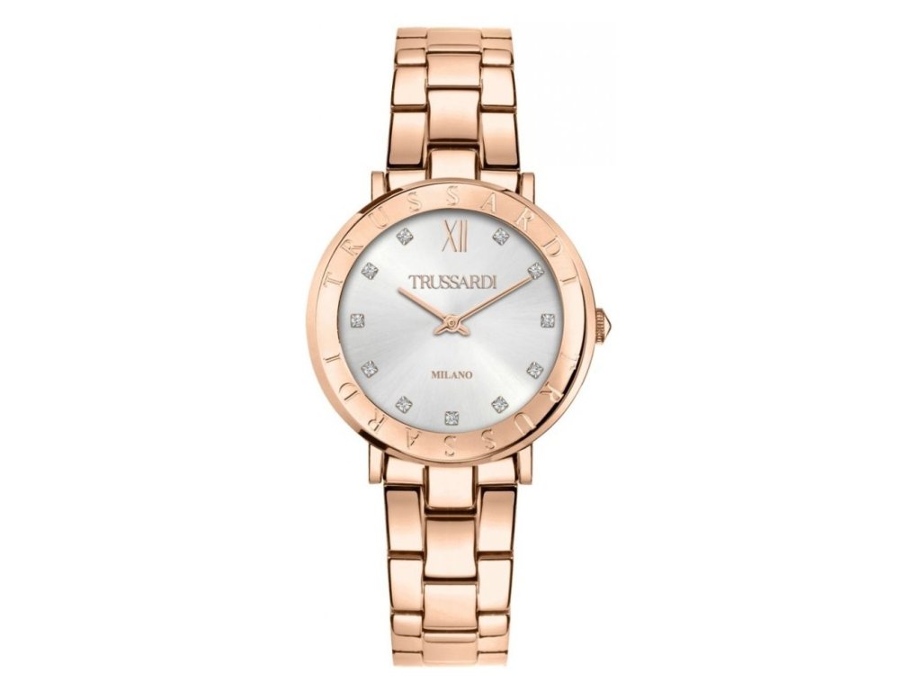 Krásné dámské quartzové hodinky od italské módní značky Trussardi z řady T-Vision jsou skvělým doplňkem každé moderní ženy. Hodinky jsou vyrobeny z nerezové oceli s PVD úpravou v barvě růžového zlata a svým průměrem pouzdra 30 mm se řadí mezi středně velké dámské modely. Bílý ciferník nabízí místo klasických indexů diamanty a chrání minerální sklíčko. Celkový vzhled hodinek doplňuje tah z nerezové oceli v barvě růžového zlata s překlápěcí sponou. Hodinky mají vodotěsnost 50 M a snesou běžný styk s vodou jako je umývání rukou a déšť.